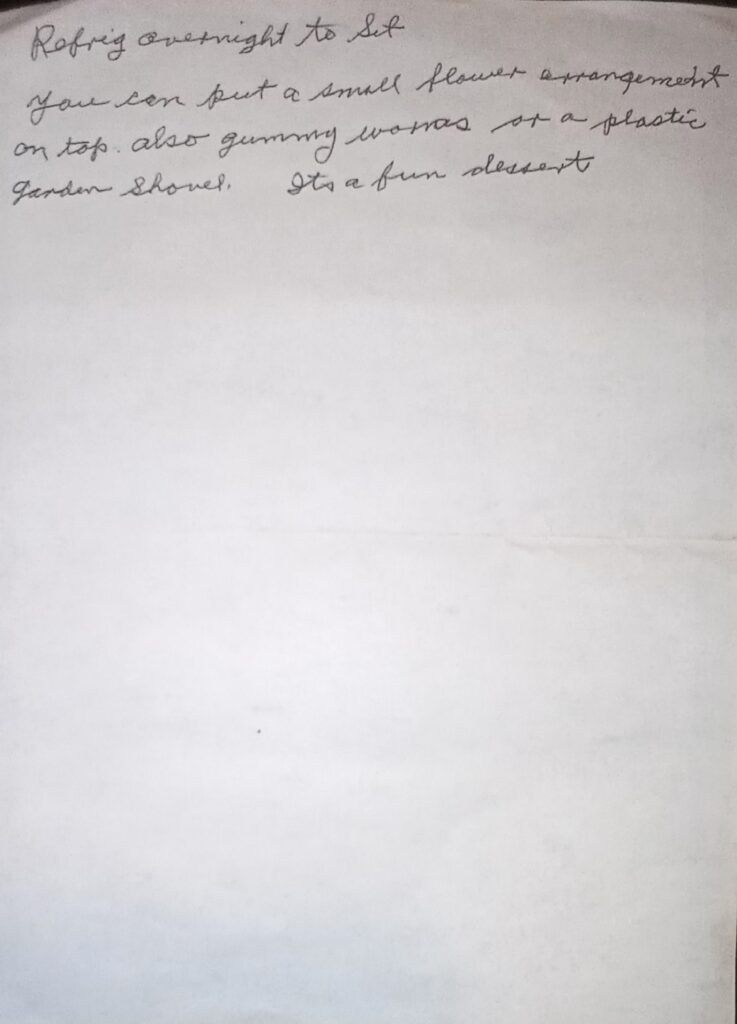 Refridge overnight to set. You can put a small flower arrangement on top, also more gummy worms and a plastic garden shovel. It’s a fun desert!